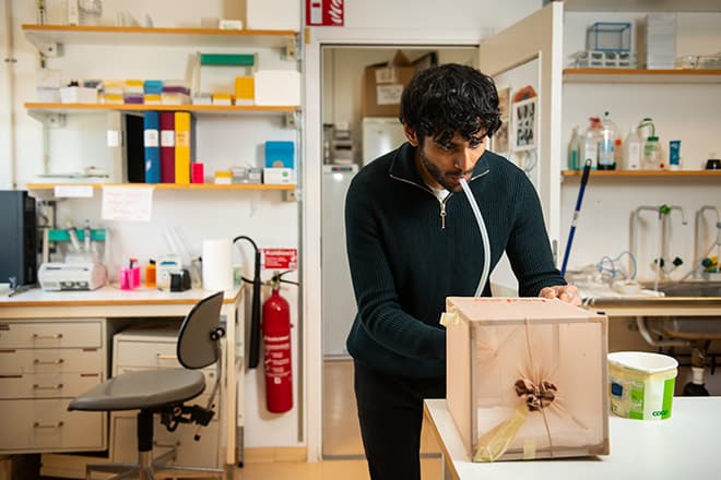 Rahul Krishnan undersöker i sitt masterarbete hur den dödligaste malariaparasiten, Plasmodium falciparum, beter sig inuti myggor. Han tar något som liknar ett stort sugrör med ett nät på mitten. Han suger in myggan mot nätet och blåser sedan försiktigt ut den i en liten papplåda. En etikett på lådans kant avslöjar att den vid något tillfälle har innehållit lösgodis.